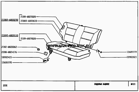 ВАЗ 2131, 2130, 2129, 21217, 21214, 21215, 21216, 21217, 21213 "Нива" - Сиденье заднее (2131) NIVA-FAQ Каталог запчастей Niva-FAQ Автор Сиденье заднее (2131)10902021Болт М6х12 10902421Болт М6х20 12605370Шайба 6 стопорная 2102-6820062Буфер 2108-6824176Облицовка петли 2108-6825020Каркас спинки заднего сиденья 21083-6820230Спинка заднего сиденья 21083-6822610Обивка спинки 2109-6823020Каркас подушки заднего сиденья 21093-6820110Подушка заднего сиденья